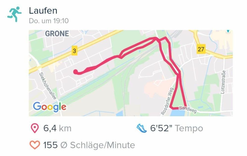 Fast identische Zeiten, sehr ähnliche Schrittzahlen, völlig unterschiedliche km-Anzahl (Abweichung ~ 12%). Alle anderen getesteten App weisen diese Strecke übrigens mit 6,8 - 6,9 km aus (getestet mit Strava, Huawei Health und Endomondo).