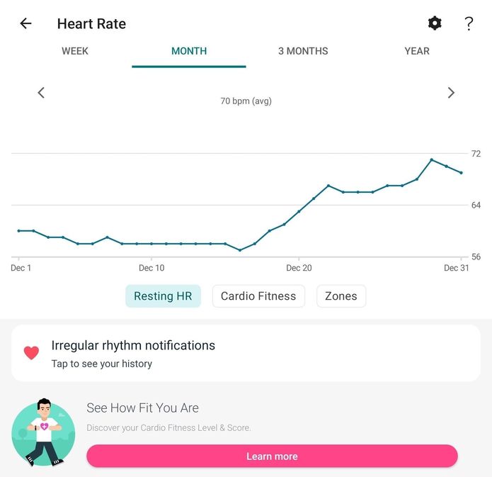 The monthly RHR (Resting Heart Rate) average does not add up. For example, if I took the month of June, and added up my RHR using the data for each date, it would average to about 58. However, because the last week of the month was averaging 64, it shows the whole month as 64! Same with last December, where it literally made up a number (70) for the monthly average that was about 10 higher than it should have been. In months, where there are no spikes at the end of the month, it seems to calculate correctly.