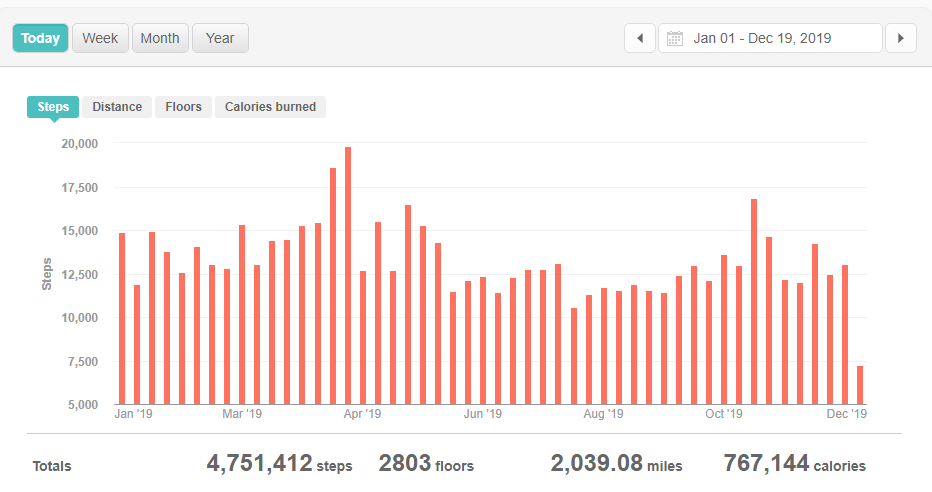 I hit 2019 miles the first week of December. Had I not forgotten my charger and had a dead Fitbit for 12 days of my very active September vacation in Italy, Switzerland and the Netherlands, would’ve hit 2019 miles in mid November.