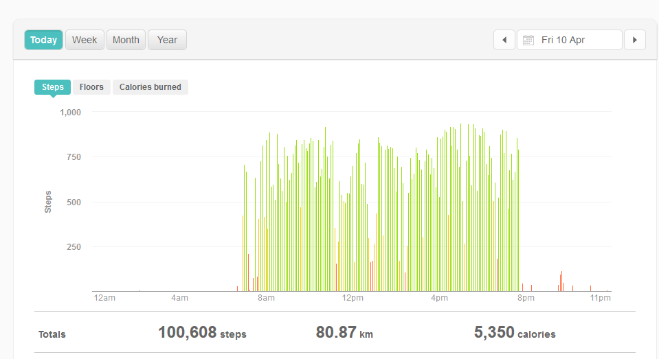It looks like nearly all your steps were between 8am and 8pm (12 hours). I don’t know how you did it. Let’s say 96k of your steps where during these 12 hours and the remaining 4k during the rest of the day. 96k steps in 12 hours is 8000 steps per hour, 133 steps per minute. When walking briskly, I average 120-125 steps per minute (about 2 steps per second). Even if I did that 12 hours straight, without any pause at all, I wouldn’t get 96k steps. This means you must have been running quite a bit (probably the highest bars with about 900 steps per 5 minutes = 180 steps per minute). Are you a runner? Because 80.9 km is almost the equivalent of two marathons.
