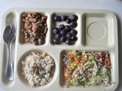 I decided to go cafeteria style for awhile, so people have a better idea of the ingredients. As I understand it, The major difference between Dr. McDougall and Dr. Fuhrman for those losing weight is Dr. Fuhrman would put some nuts in the empty spot.