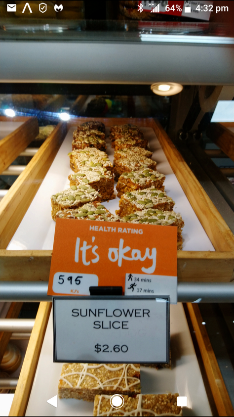 I like that they post the calories for both items, though. I mentally translate the high calorie counts for things like bakery items or pizza into something a little less processed like eggs or apples. Helps me realize that even the “Okay” rated Sunflower Slice (= 4 to 6 apples or eggs) should be split with someone and paired with a whole food of some kind ... unless the plan is to gain weight.