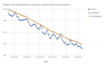 Here's current Predicted, Actual, and smoothed Actual weight (a' la TrendWeight).   Fitbit underestimates my calorie deficit by about 180 calories, so when I add that error into my Predicted weight as a daily bias, the curves line up amazingly well.
