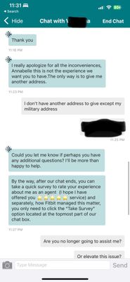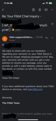 My Sense 2 malfunctioned and I was emailed the replacement or 50% off a new device offer. I chose to replace it, only to discover on the replacement order site that Fitbit no longer mails to military addresses or PO boxes. I'm stationed overseas and have no way to get my replacement sent to a local address. I could send it to a family member who would then mail it to me but that would mean paying an additional charge to mail the device. I shouldn't have to pay especially since the device malfunctioned while under warranty.