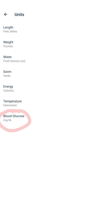There is no blood glucose option in the Units. Just LENGTH, WEIGHT, WATER, SWIM, ENERGY, TEMPERATURE. There is no Blood Glucose heading