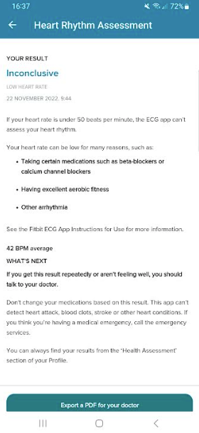 - ECG: fails for me saying that it cannot operate when my heart rate is less than 50 - so no benefit there (and it then gives a correct heart rate!).