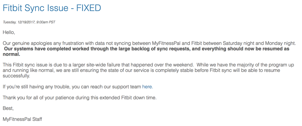Fitbit Update 12/19/2017: This issue is now resolved and you should be able to successfully sync your Fitbit/MFP accounts once again.