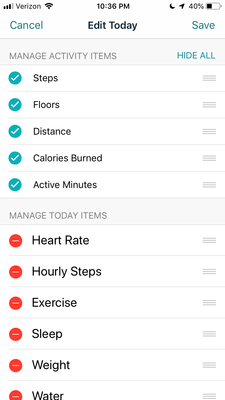 Looks to me like Activity Items are first on Today screen. Those are the steps, floors, distance calories burned, and active minutes with the green circles at top.